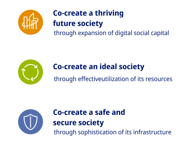 “共创充满活力的未来社会”旨在创建一个面向未来不断创造出新价值,所有居民均能享受该价值的繁荣舒适的社会。NRI以高度化客户业务流程的DX1.0和与客户共同创造新业务的DX2.0为双轴,推进数字转型(DX),创出新业务,并积极创建与客户的共同事业。
