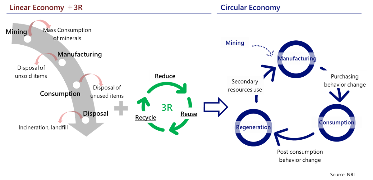 Linear economy is a unidirectional socioeconomic system of "Resource extraction or Mining→ Product Manufacturing → Consumption → Disposal". As the population grows and living standards improve, production, consumption, and waste have steadily increased, resulting in issues such as waste generation exceeding processing capacity. To address these issues, 3Rs (Reduce, Reuse, and Recycle) have been promoted.