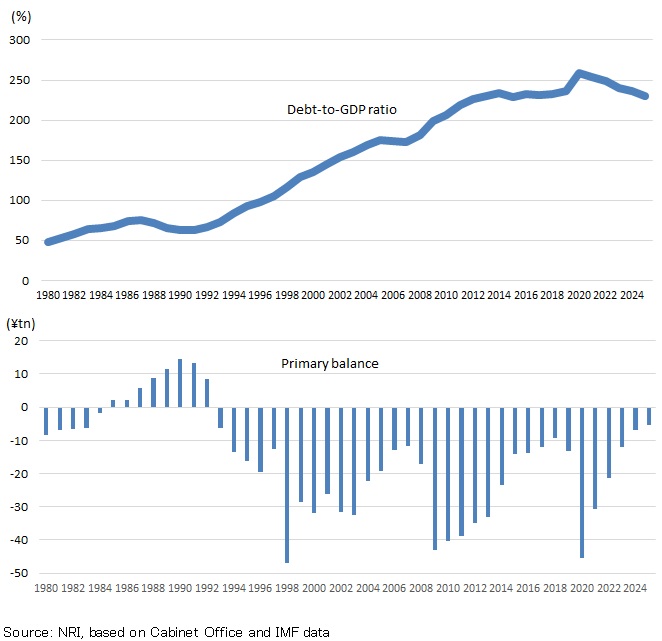 The modest recent decline in the debt-to-GDP ratio is therefore not sustainable and is clearly a transitory phenomenon. For the Takaichi administration to cite this decline as grounds for continuing along an expansionary fiscal policy path would undermine confidence in fiscal policy among financial market participants. If the administration opts to implement such policy by issuing more debt and increasing the primary deficit, it could cause a marked rise in the future debt-to-GDP ratio. We think the government needs to exercise caution in this regard.