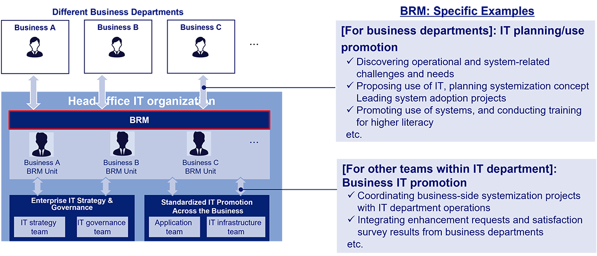 A North American manufacturer set up BRM teams aligned to functions like R&D, sales, and procurement. It regionalized its BRM teams for more localized support and moved from external consultants to in-house talent trained near top universities. This shift strengthened trust and collaboration between IT and business units.