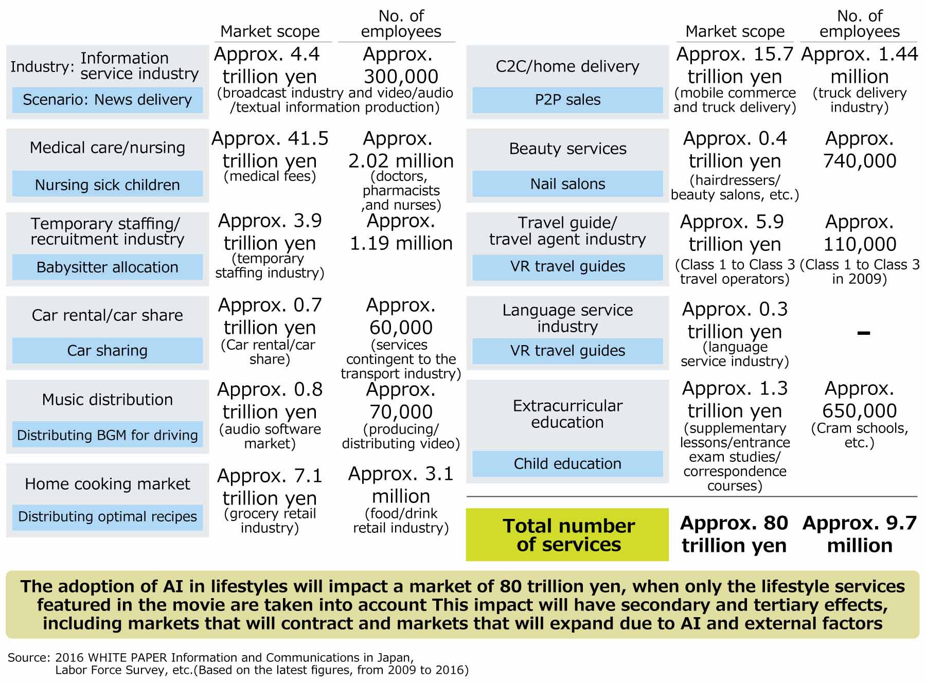According to a survey by NRI, the markets for the lifestyle services that appeared in the above video is currently worth about 80 trillion yen. New businesses will be created in these markets as AI technologies are adopted.