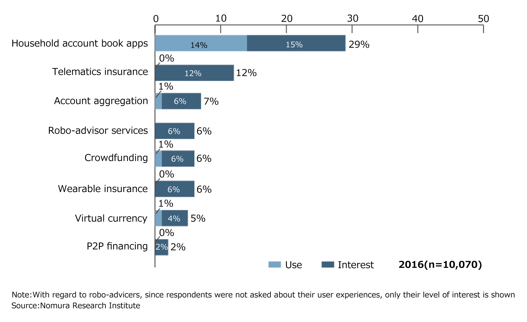 “Most of the services still aren’t being used at this point,” says NRI’s Natsuki Abe, who was in charge of conducting the survey. “Even with household account book apps, which are seeing the most use, it looks like users are mostly just installing cashbook apps on their smartphones. Their level of interest in FinTech is low, and despite the fact that people around the world are talking about it, our sense is that consumer familiarity with the service isn’t really growing.”