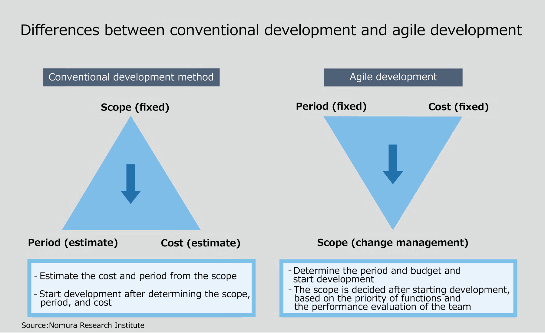 Japanese companies do not like uncertainty, and their hierarchical corporate structure and love of clearly defined rules mean that waterfall development matches the culture. On the other hand, the concept of agile development that continues to flexibly change the plan according to the station has developed in a background of Western culture, which is not opposed to uncertainty. We believe that Japan needs to make an effort to even partially adopt agile development in the actual development of suitable projects, while also retaining waterfall development.