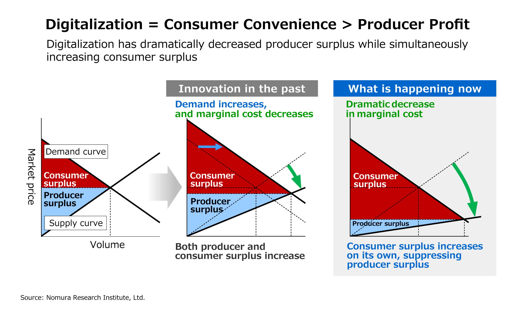 Ever since the Lehman Shock, countries throughout the world have experienced a slowdown in their GDP growth, and the world economy has fallen into a long period of stagnation. Japan is no exception. Despite these facts, however, a survey by NRI has shown that, since around 2010, there has actually been a gradual increase in the number of people in Japan who feel that their living standards have improved. The reason, Konomoto stated, is an increase in consumer surplus, a statistic that is not shown in the GDP.