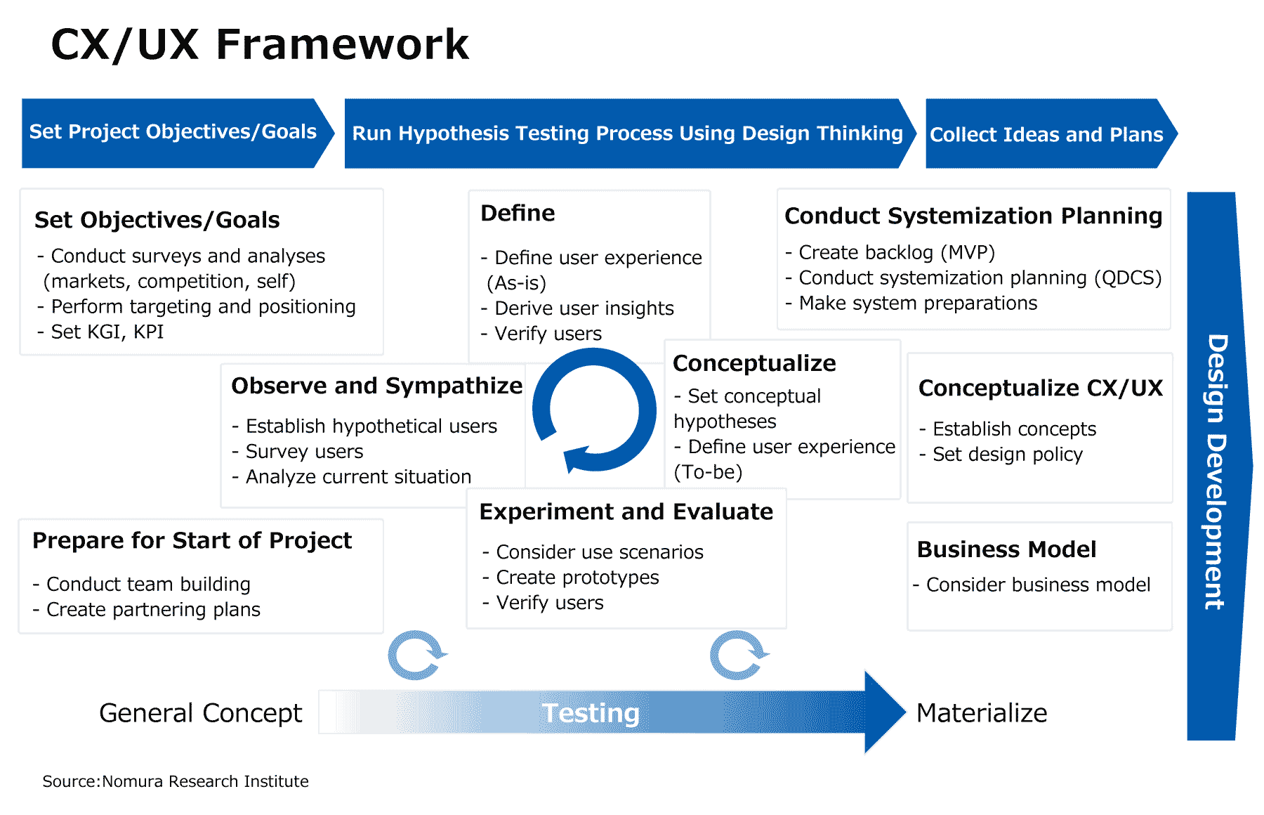 Companies need to foster a culture and a mentality that’s more customer-centric. They would probably then need to integrate their multiple interested business segments to create an organization that can broadly observe their customer contact points as a whole. NRI is here to help, and so we’re conducting digital thinking training to encourage the development of this mentality. Taking a co-creative approach with our customers, we hope to provide total support from the initial conceptualization stage all the way to practical application towards solutions and ultimately development.