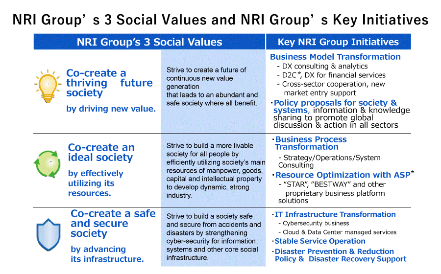 "Co-creation of a thriving future society" means the continuous generation of new values for the future and the creation of an affluent and comfortable society that all consumers can enjoy. As an example of this, NRI is promoting Digital Transformation (DX). Using both the approaches of DX 1.0, which uses digital technologies to advance clients' business processes, and DX 2.0, which works with clients to create new businesses, we have launched joint ventures in the last year with DMG Mori Seiki Co., Ltd., Shiseido Japan Co., Ltd., DENSO Co., Ltd., and Nippon Airlines Co., Ltd., and plan to continue these activities is the future.