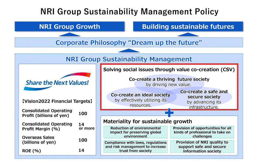Based on this history, NRI's long-term management vision "Vision2022" and vision statement "Share the Next Values!" were formulated in 2016 to express NRI's intention to continue to take on the challenge of creating new value. The Medium-Term Management Plan 2022, which was formulated to realize the Vision2022, newly clarified CSV (Creating Shared Value) initiatives as a solution to social issues through value co-creation, in addition to the non-financial objectives "Materiality for sustainable growth" linked to growth strategies. Through these initiatives, the NRI Group is promoting sustainability management that balances sustainable growth with the creation of a sustainable future society.