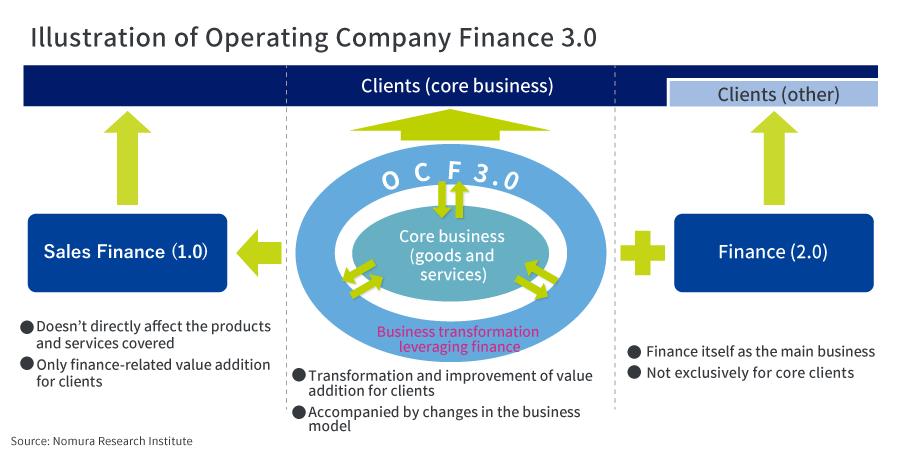 Hatoya: Operating Company Finance (OCF) refers to the operations of financial services by companies whose core business is not providing financial services, such as those in the manufacturing and distribution sectors. Examples include “OCF version 1.0”, in which operating companies provide financial services to clients to facilitate their sales of products and services; “OCF version 2.0”, in which finance business is undertaken to generate additional profit alongside the company’s core business; and the currently booming “OCF version 3.0”, which aims to transform the company’s core business by leveraging finance.