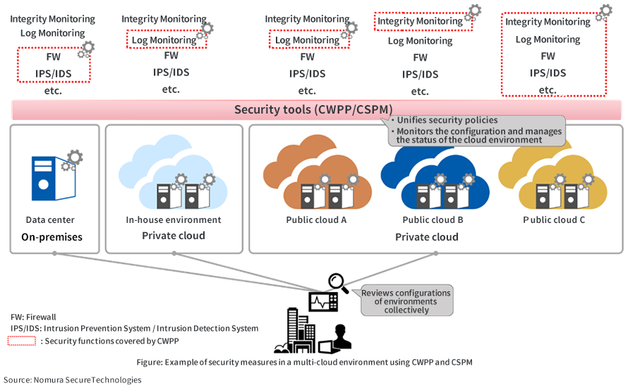"CWPP and CSPM are solutions that allow centralized management of security policies across clouds as well as across subscription accounts within the same cloud. CWPP provides a variety of information security features for workloads on various cloud services. On the other hand, CSPM is a solution that helps in continuously monitoring configurations and maintaining appropriate status, primarily for the range of operations available on the cloud service management screens. With these solutions, you can compensate for the deficiencies of each cloud environment and maintain a baseline of security measures by continuously evaluating cloud environment configurations."