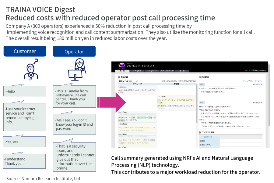 The Nomura Research Institute (NRI) system “TRAINA”, which uses AI (artificial intelligence), supports reduced workloads and increased efficiency at contact centers facing severe human resource shortages. TRAINA picks up and comprehends speech, searches for necessary information, gives advice, and takes records, but how does it accomplish these things? In our last installment of this three-part series introducing the present state of contact centers being changed by AI and possibilities for the future, we asked NRI’s Yuki Kitamura and Tomoyasu Okada, who have been involved in development for many years, about TRAINA’s technological characteristics and their aspirations for its development.