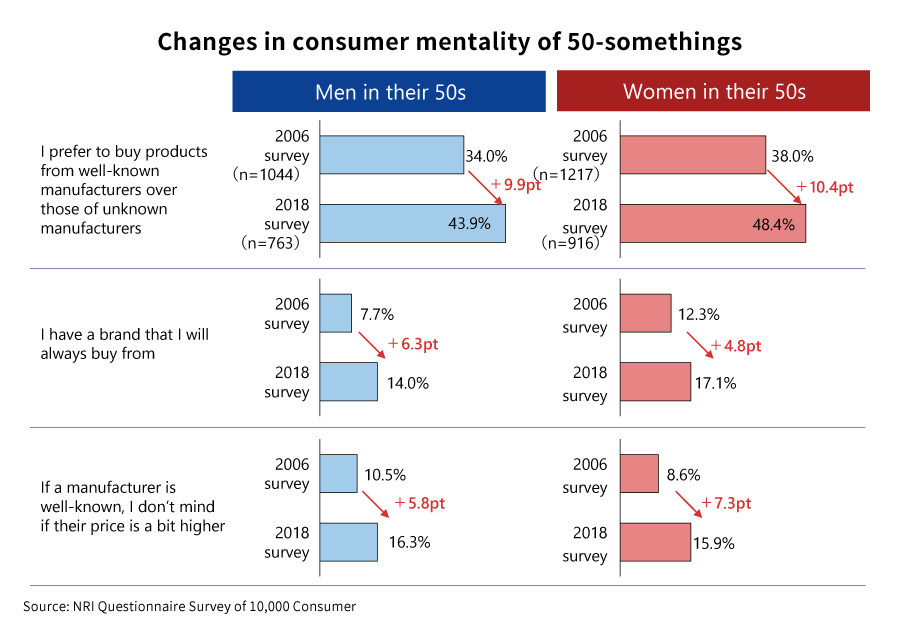 Takahashi: Conventional senior strategies targeted people age 60 and up, or age 65 and up, but I recommend building a senior strategy from a long-term perspective including pre-seniors, people in their 50s, who are on the verge of becoming seniors. We can find hints for such strategies by using the results of the “NRI Questionnaire Survey of 10,000 Consumers” and performing chronological analysis. For example, in the most recent survey, it was revealed that people in their 50s have strong brand preference, and branding takes at least 10 years or so. It will be effective to revise conventional senior strategies with an eye towards ten years in the future.