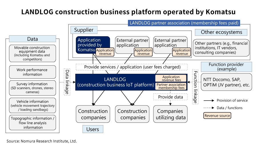 One example is Komatsu's open IoT platform “Landlog”. While AWS (Amazon Web Services) and others provide IoT cloud platforms that connect various things to the Internet for all kinds of industries, Landlog specializes in the construction industry. It builds models that accumulate all kinds of construction-related data, like data on the construction equipment of your company as well as others, site data measured using drones etc., and worker data etc., and also involves other IT application vendors, to provide construction-related solutions.