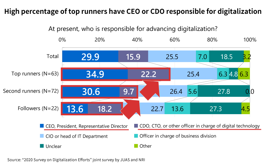 Miyata: One aspect is that they have a higher proportion of top management taking responsibility for digitalization. If the top management conveys the company’s mission to its employees with strong resolve, the employees push forward even with difficult projects, and it is possible for digitalization to permeate the entire company. Conversely, if performance has been good and the top management feels no need to change their business model and no sense of crisis, digitalization is unlikely to progress.