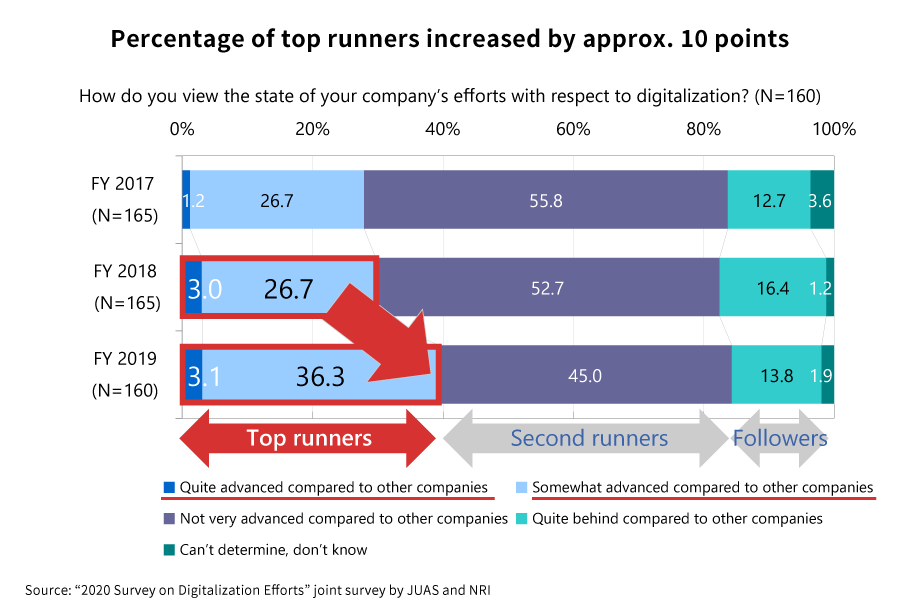 Miyata: We call companies that responded that their digitalization efforts are more advanced than those of other companies “top runners”. Last year, the percentage of top runners increased by 10 points compared to 2018. Top runners are proactive in advancing digitalization, and the disparity between them and other companies is increasing year by year. Further, the percentage of companies that said they’re already partnering with other companies in their advancement of digital business exceeded half, and each year there are more companies that are introducing new technology in earnest.