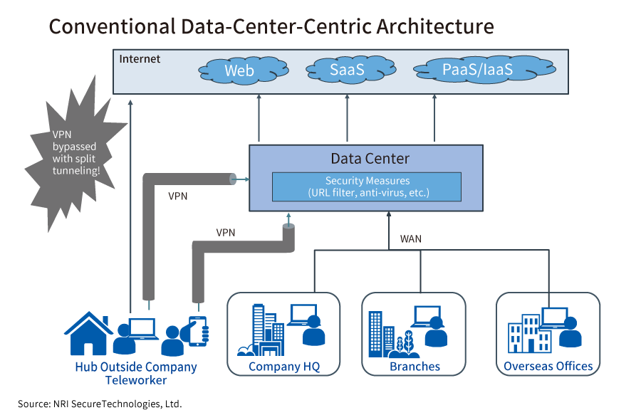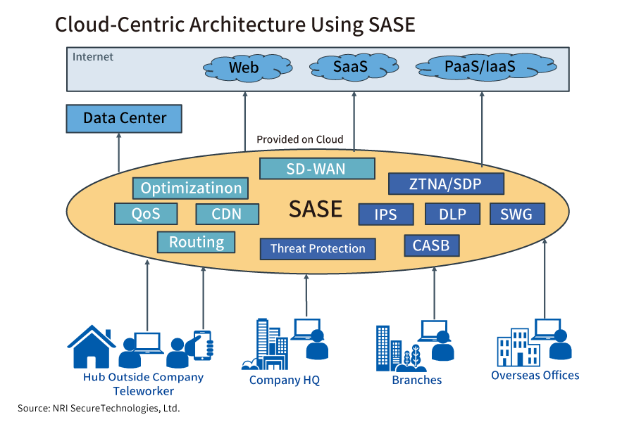 To solve this problem, companies should transition to a cloud-centric architecture, which works by keeping PCs connected to a security gateway in the cloud at all times to ensure security, and by allowing access to all locations, including those within the company, under those security conditions. This approach has been proposed by Gartner, Inc. as the new concept of SASE (secure access service edge). By forcing users to be constantly connected to a security gateway in the cloud, companies can strengthen security while minimizing the impact on performance.