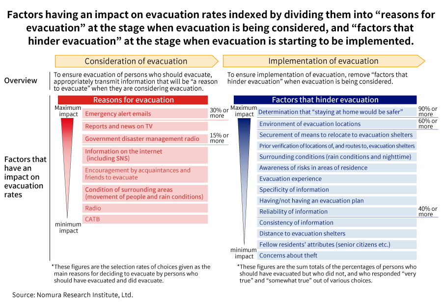 When factors that have an impact on evacuation rates are indexed by dividing them into “reasons for evacuation” at the stage when evacuation is being considered, and “factors that hinder evacuation” at the stage when evacuation is starting to be implemented, as the reasons for evacuation, emergency alert emails and disaster prevention government radio had a large impact on evacuation rates, and as factors that hinder evacuation, the residents’ determination that “staying at home would be safer” and concerns about the environment of the evacuation shelter played a large part.