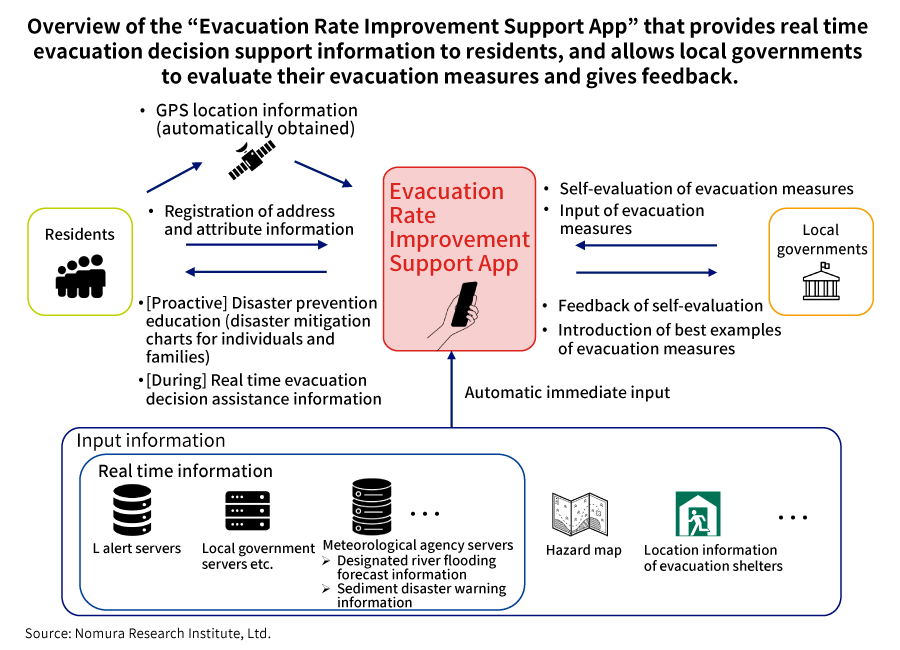 As a method to assist with the resolution of such issues, the development of an “Evacuation Rate Improvement Support App” has been proposed. Such an app can be utilized by both residents and local governments, and by residents registering their addresses and attributes, disaster prevention education can be carried out by providing disaster mitigation charts for individuals and families before disasters, and by providing real time evacuation decision assistant information based on GPS location information etc. during advisory level announcements.