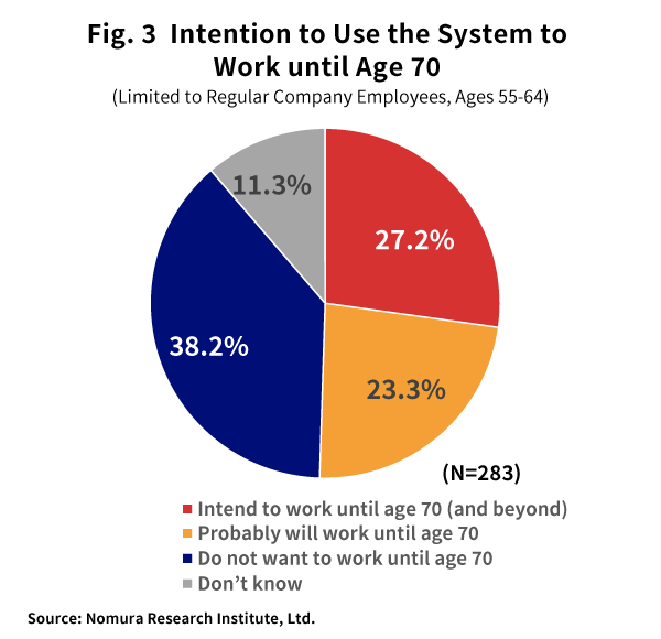 With regard to the potential use of the system, it was clear that half of respondents aged 55 to 64 who are employed as regular company employees, and thus will fall within the scope of the Employment Extension System going forward, intend to utilize the system to work until age 70. Approximately 27% of respondents said they will “work until or beyond age 70”, and an additional 23% said they will “probably work until age 70”. Respondents aged 60 to 64 regarded this as a more real issue than people aged 55 to 59, and thus showed greater willingness to work until age 70. In addition, the actual age to which those planning to “work until or beyond age 70” wanted to continue working was 72.8 years on average, suggesting that 70 is decidedly not a cutoff point and that many people want to continue working even longer.