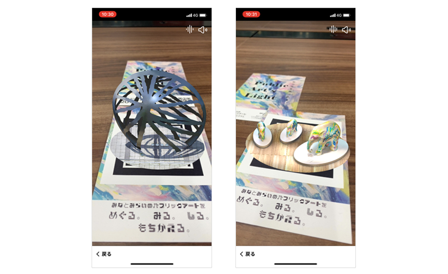 Irie: When the QR code on a postcard is scanned, you’re connected to the app and a map of Minatomirai appears. A number of different ways to get to the venue are displayed, so that even families on their first visit to Minatomirai can enjoy walking around the city on their way to the venue, following routes that pass by works of art owned by private companies like Nissan Motor, Keikyu Corporation, and Shiseido, or that feature colorful art, for example. In addition to providing information about the art, such as the artists, owners, and background, we also included a feature where, by selecting “View in AR”, a faithfully reproduced AR representation will appear on the postcard. We realized that we could provide enjoyment to families with children, and everyone else, through renditions that could not be done in reality, made possible only with XR technology, like playing an animation of an anchor statue falling to the seafloor and adding a metallic sound to impart a sense of realism.