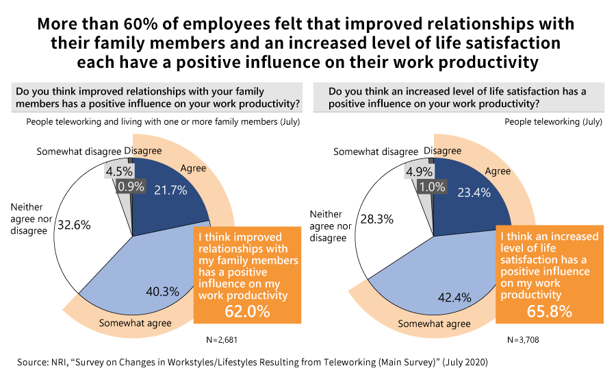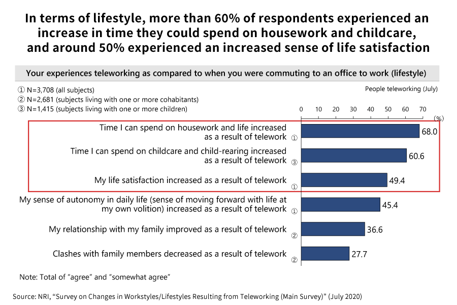 Further, more than 60% of respondents experienced an increase in time they could spend on housework and childcare, and around 50% experienced an increased sense of life satisfaction. These trends were also seen more prevalently in women than in men, and more in those in their 20s and 30s than those in their 40s and 50s.