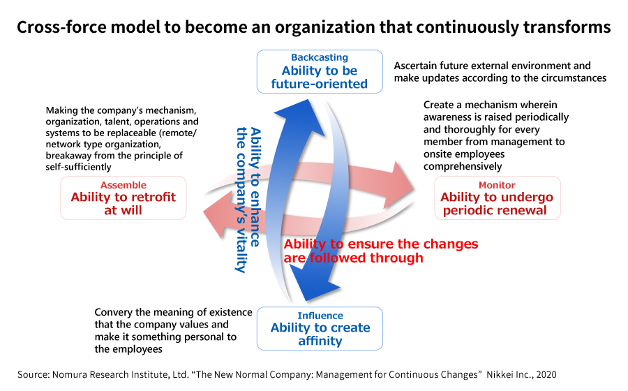 Sudo: It seems that even if businesses have “the ability to be future-oriented”, they are weak in “the ability to create affinity”, which is necessary to ensure that all employees can easily understand and digest the concept. Gathering all employees for a 30-minute presentation by the company president will not suffice as a method of ensuring this. “The ability to retrofit at will” is also lacking. American companies replace personnel when skills that are required change with digitalization, but that is not something Japanese businesses can do. In order to carry out a transformation while utilizing existing personnel, it is necessary to have, from the beginning, a mechanism that will easily allow new recombinations.