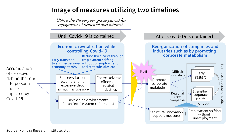 To that end, “timeline-based policies” such as “immediate support for economic activity and companies” and “medium- to long-term corporate reorganization and employment shifting promotion” are necessary, and the key is how to make effective use of the three-year grace period for special Covid-19 loans. In other words, until Covid-19 is completely contained, it would be best to develop an environment geared toward an “exit” while suppressing drastic changes by revitalizing the economy and continuing corporate and employment support measures, and once Covid-19 has been completely contained, to aim for corporate reorganization, industrial reorganization, and improved productivity by promoting corporate metabolism and re-employment without unemployment.