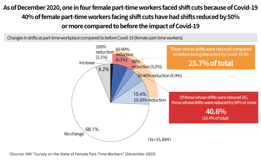 In December 2020, Nomura Research Institute (NRI) conducted an internet survey of 55,889 female part-time workers around the country, 5,150 of whom experienced reductions in their work shifts as a result of the spread of Covid-19 infection.