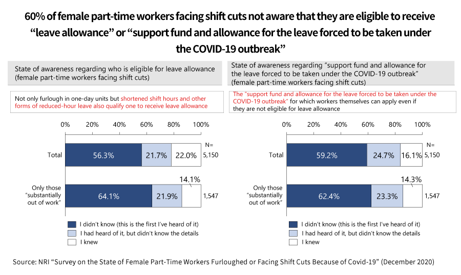 Nearly 60% of female part-time workers whose shifts were cut had no awareness at all that “those whose shifts were cut are also eligible to be paid leave allowances”, and only 20% were aware of this fact.