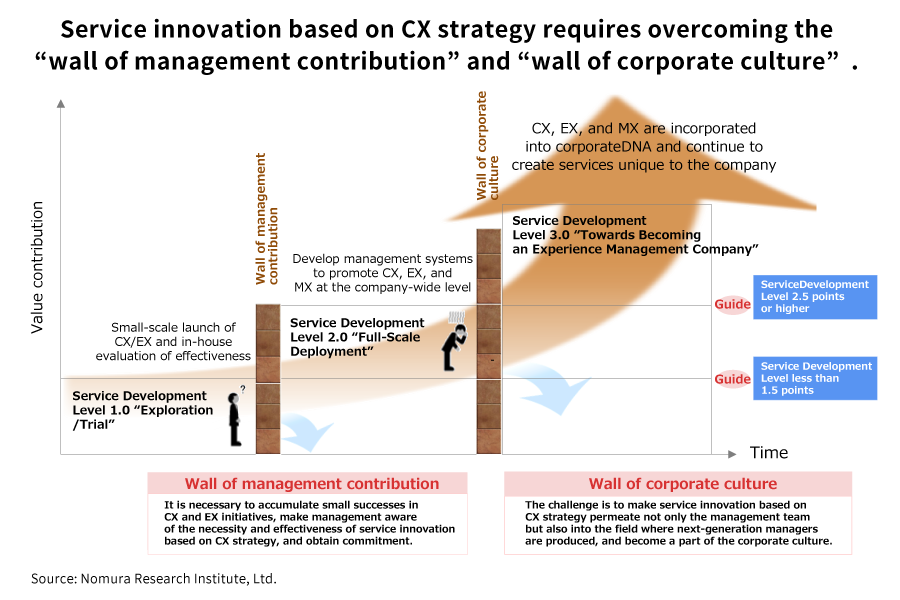 “Service Development Level 1.0” is a stage where the need for service innovation is not understood by management. In this stage, CX and EX initiatives should be made at the field level. It is important to make efforts to accumulate small successes, make management aware of the necessity and effectiveness of such initiatives, and obtain commitment.