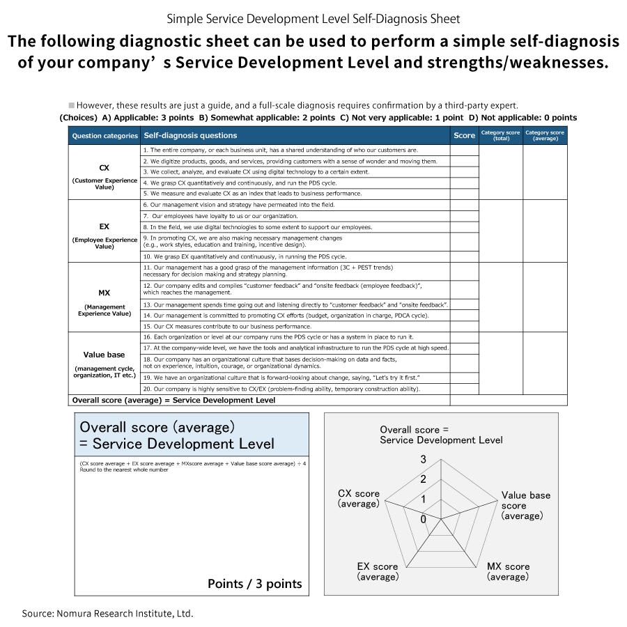 In this diagnosis, a company is considered to have attained “Service Development Level 1.0” if the overall average score is less than 1.5 out of 3 points; “Service Development Level 2.0” if it is 1.5 points or more and less than 2.5 points; and “Service Development Level 3.0” if it is 2.5 points or more.