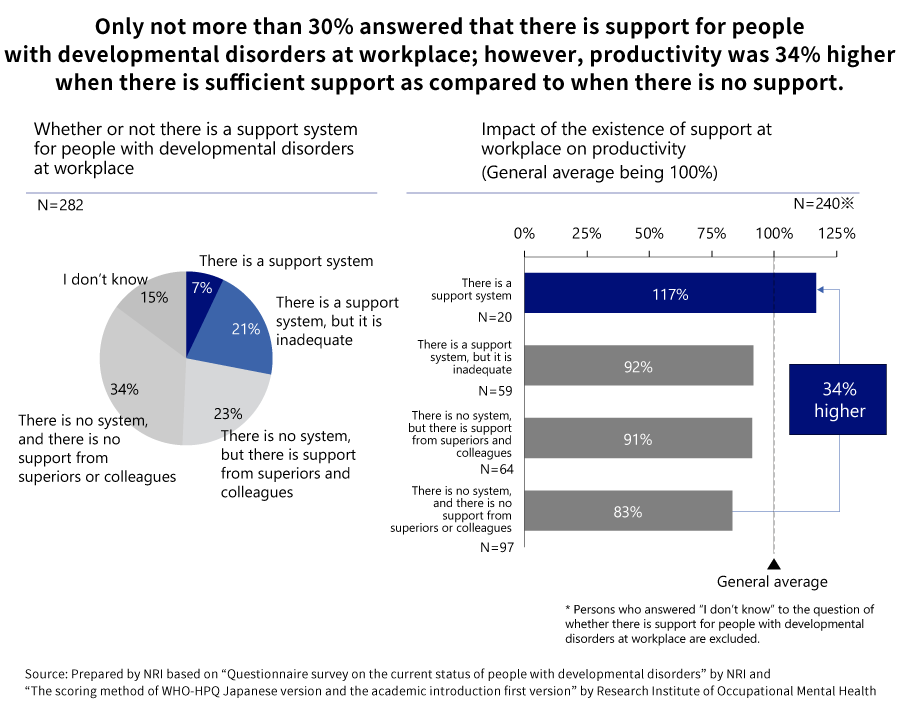 Of the overall responses to our question on whether there is any workplace support system related to developmental disorders, only 7% answered that “there is a support system” and 21% answered that “there is a support system, but it is inadequate”, meaning that less than 30% answered in the affirmative.