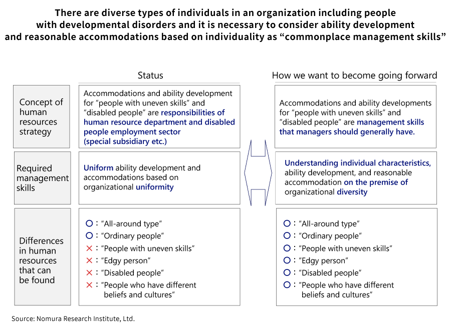 As a result of the decreasing birthrate and aging of the population, and changes to industrial structures, the securing of industrial personnel is imperative. One possible resolution of this issue is for people with developmental disorders to become more active. Doing so makes it necessary to utilize, in the general employment sector, the reasonable accommodation know-how cultivated through a framework for employing people with disabilities, so that people with developmental disorders and others in the general employment sector have more opportunities to become active.