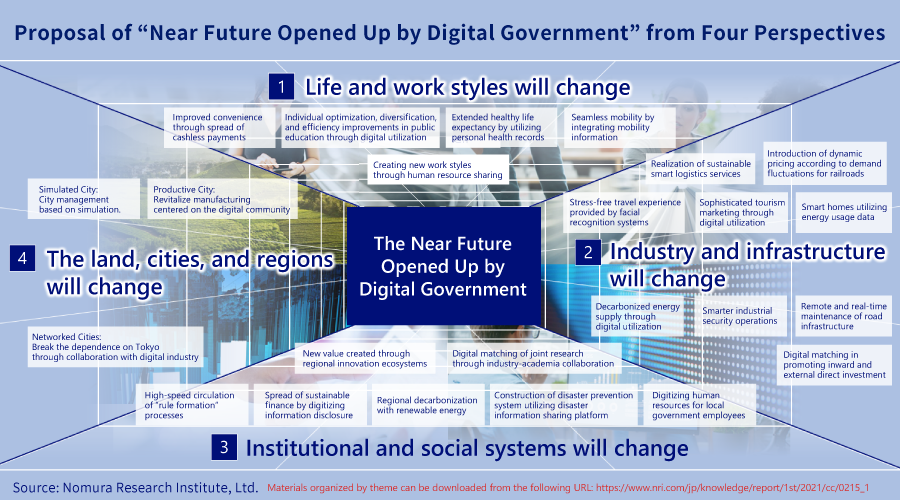 Digital government will change the very ways of society; what sort of future will it open up? NRI is making proposals from four perspectives: “life and work styles will change”, “industry and infrastructure will change”, “institutional and social systems will change”, and “the land, cities, and regions will change”.