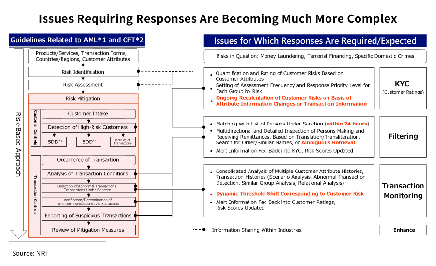 In the following chart, the particulars of the “Guidelines for Anti-Money Laundering and Combating the Financing of Terrorism” published by the Financial Services Agency are organized according to primary systemic functions. Structured fundamentally around a risk-based approach that will implement countermeasures with a focus on high-risk customers, the chart is divided into the issues for which responses are required/expected for each of the three main functions.