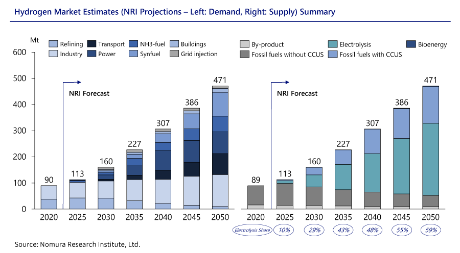 Tomoki Hamano echoes concerns about the Japanese situation. “In December 2017, Japan took the lead globally by formulating the Hydrogen Basic Strategy. But precisely because Japan was so far ahead of the curve, there was a limit to what we could do alone; specific areas of focus and balance with the rest of the world were never fully articulated, and so the efforts languished at the proof-of-concept level. Alongside these circumstances, domestic companies revealed a deep-rooted ambivalence in their tone about renewable energies, indicating a different level of enthusiasm than overseas. Japan’s approach to resource allocation and its sense of urgency undeniably lagged behind those of its peers.” For these very reasons, NRI has conducted a forecast study on the hydrogen market’s forthcoming prospects, with the aim reaffirming the current global reality of breakneck progress in the hydrogen shift.
