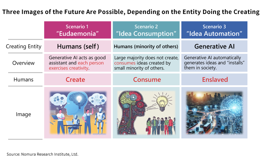 Three images of the future are conceivable for the creative society, based on differences between the entities doing the creating. In Scenario 1, “Eudaemonia”, generative AI acts as a daemon (spirit from ancient Greek mythology), i.e., good assistant, and human beings exercise creativity. In Scenario 2, “Idea Consumption”, ideas are created by a minority of humans and consumed by a large majority of humans. In Scenario 3, “Idea Automation”, generative AI automatically generates ideas and humans are de facto slaves. Mr. Mori noted, “Needless to say, Scenario 1, where generative AI acts as a eudaemon to improve human wellbeing while simultaneously pursuing economic growth, is the best image of the future.” He then brought his session to a close by observing, “Japan has the potential to utilize generative AI to drive the creative society worldwide. The image of the future we create will depend on our choices and our actions.”