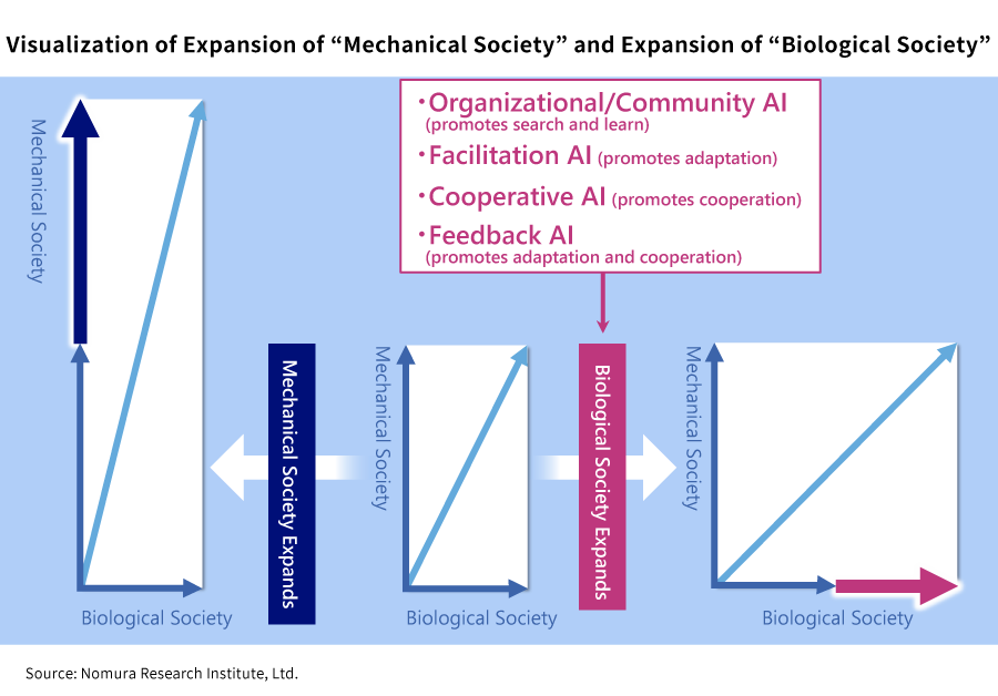 In a multipolar world, the future of social systems will not take one uniform shape, and the expectation is that there will be a multidimensional future defined by differences specific to societies and cultures. Two major orientations – namely, the “mechanical society” and the “biological society” – are conceivable in such a multidimensional future.