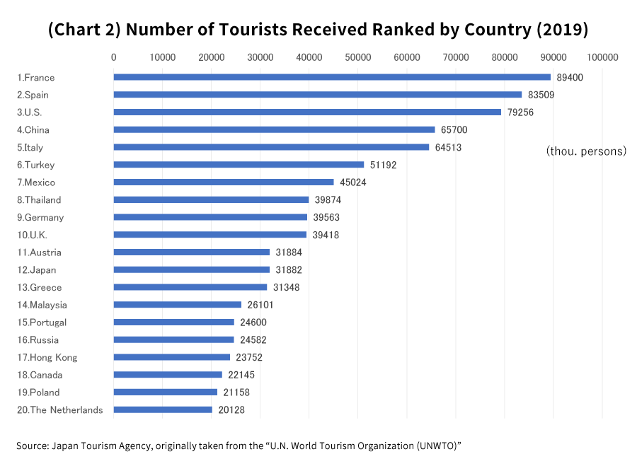 Japan had 3,188,200 foreign tourists visit back in 2019 pre-COVID. This is around one-third of the number of travelers who visited France (the top spot), and put Japan in 12th place globally (Chart 2). Looking at Asia, we see that Japan comes in third regionally behind China in fourth place and Thailand in eighth place. While Japan is third globally in terms of economic scale, it lags behind somewhat in 12th place when it comes to the number of foreign visitors, and at present it has yet to attain the status of a tourism-oriented nation.