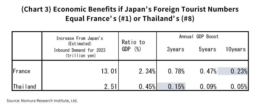 On the other hand, catching up to France’s foreign tourist numbers would be no simple feat, and so let’s also consider a case where Japan catches up to Thailand, which is in second place in Asia right behind China. In that scenario, Japan’s inbound demand from 2024 onward would instead receive a boost of 2.51 trillion yen. If this were to be achieved in three years, then the annual GDP growth rate would receive a 0.15% boost. In both cases, the estimates show that Japan could be expected to see quite an economic stimulus effect.