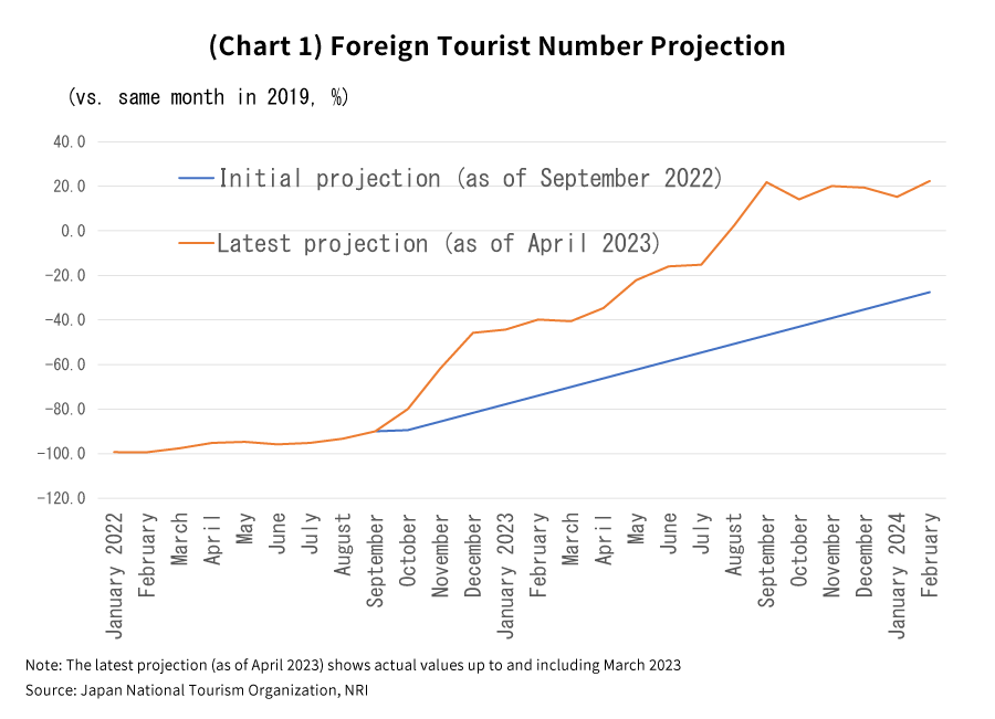 Last September before the quarantine policies were eased, I made an estimation of foreign tourist numbers, but at that time I calculated that those numbers would surpass their pre-COVID from the same month in 2019 in October 2024. In other words, I estimated that it would take about two years for those numbers to fully rebound. Now, having factored in the actual values up to and including this March as well as the effects of the eased entry restrictions on visitors from China, I’ve redone my estimate and found that the number of foreign tourists will surpass its pre-COVID level from the same month in 2019 in August 2023, significantly sooner than expected (Chart 1).