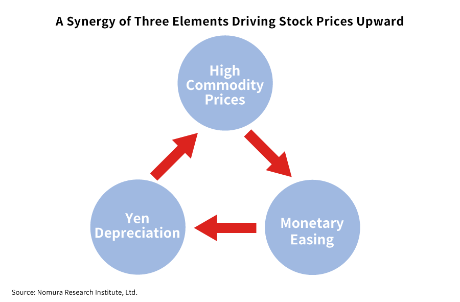 Soaring commodity prices augment the effects of monetary easing, and that furthers the yen’s depreciation. And the weak yen also leads to higher commodity prices. The three elements of high commodity prices, monetary easing, and the yen’s depreciation are thus proceeding in synergistic fashion, with each one now driving up stock prices considerably.