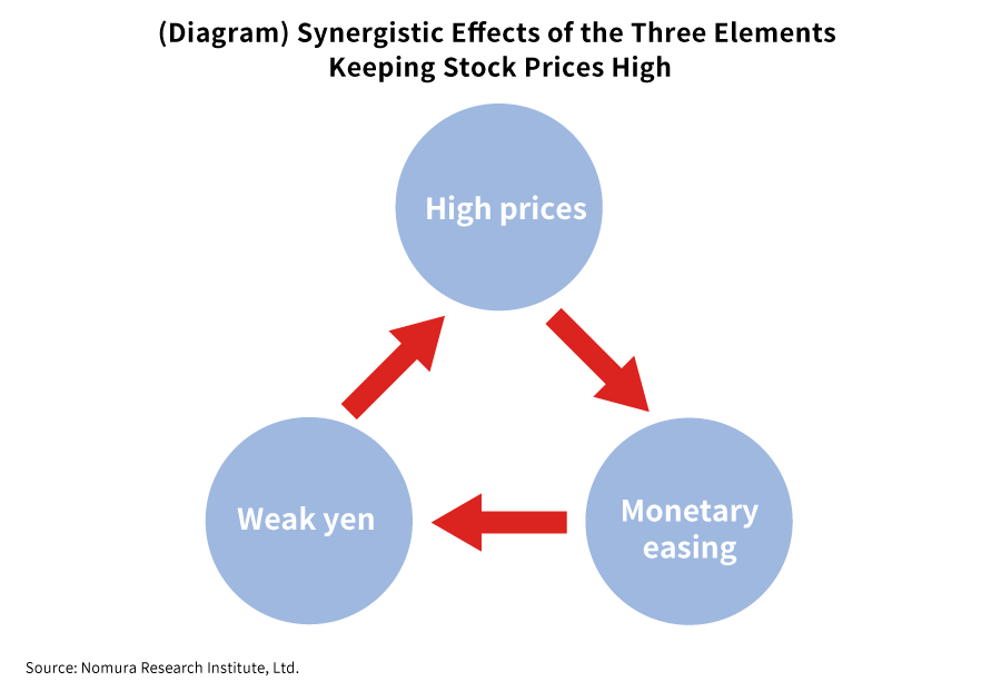Thus, I believe one could say that as the depreciation of the yen, high prices, and monetary easing have worked together synergistically, stock prices have been pushed upward (diagram).