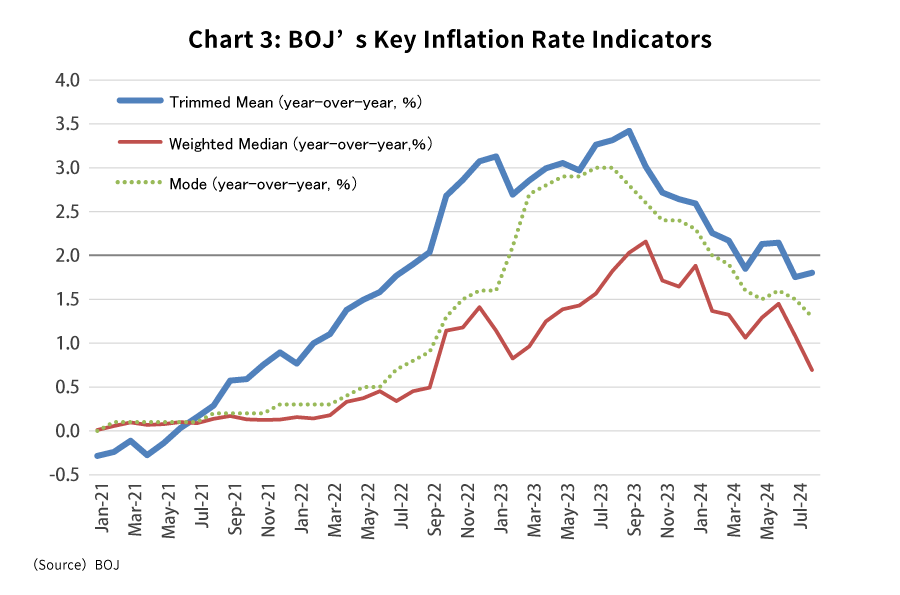 all three indicators, including the trimmed mean, are trending below the BOJ’s 2% target (Chart