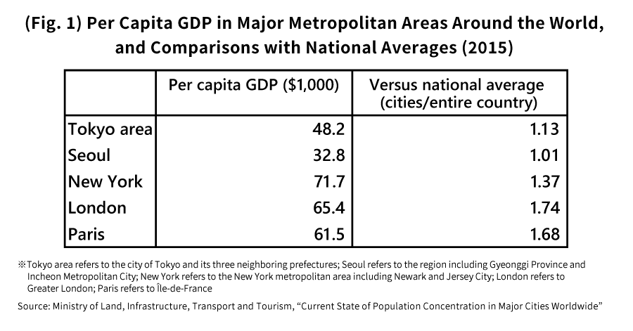 Tokyo's excessive population concentration may well be stifling the efficiency of the Japanese economy overall. When we calculate how the per capita GDP—i.e., productivity—in various capital cities stacks up against their countries’ national averages, Tokyo’s per capita GDP as of 2015 was 1.13 times that of the national average, versus New York’s at 1.37 times, London’s at 1.74 times, and Paris’ at 1.68 times, which is comparatively quite low (Fig. 1).