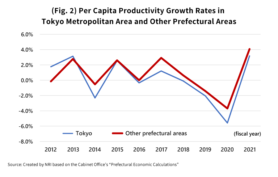 If we look at annual averages over five years up to 2021, the other prefectural areas’ productivity growth rate averaged out to +0.5%, whereas Tokyo’s was at -0.7%, sinking into negative territory.