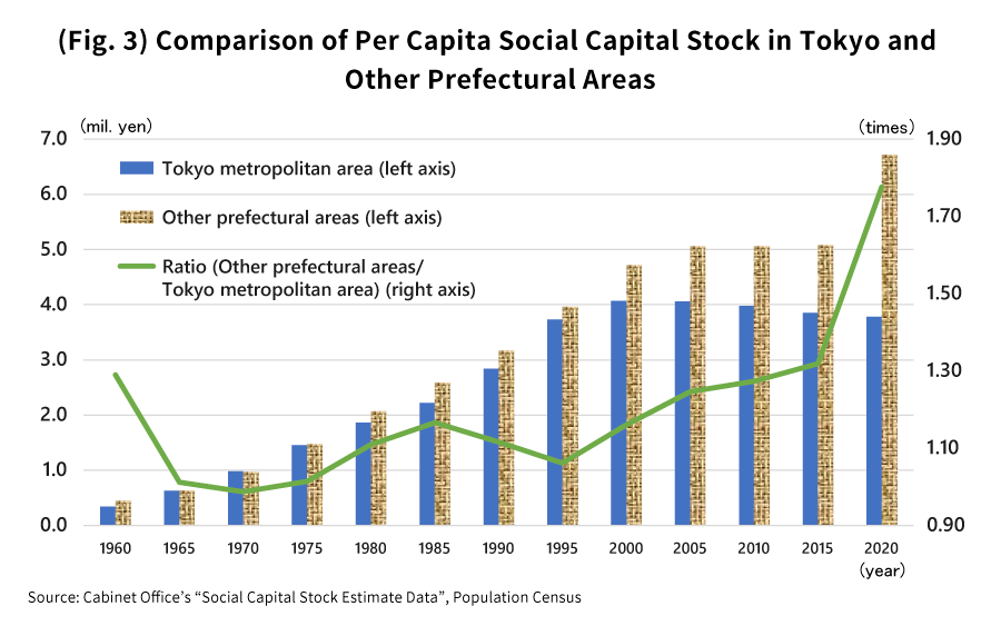 Moreover, in the five-year period from 2015 to 2020, this disparity between these two regions has grown sharply, and as of 2020, the per capita social capital stock value in prefectural areas other than Tokyo has reached 1.78 times that of the Tokyo metropolitan area (Fig. 3).