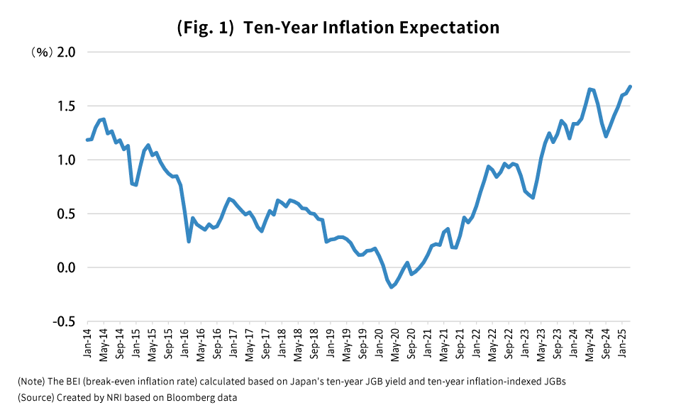 One of the indicators of medium- and long-term inflation expectations on which the Bank of Japan appears to be placing great importance is the inflation expectation in the financial market, as calculated based on inflation-indexed JGBs. The ten-year inflation expectation has been on an upward trend ever since 2021, and currently sits at around 1.7% (Fig. 1).
