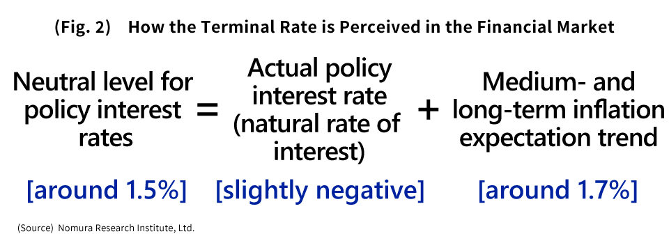 This is because if we assume that the Bank of Japan will raise policy interest rates to a neutral level with respect to economic activity and prices, and that this level will be the terminal rate, then presumably it will be a matter of adding together the neutral real interest rate (nominal policy interest rate minus inflation expectations)—or the so-called “natural rate of interest”—and the medium- and long-term inflation expectation trend.