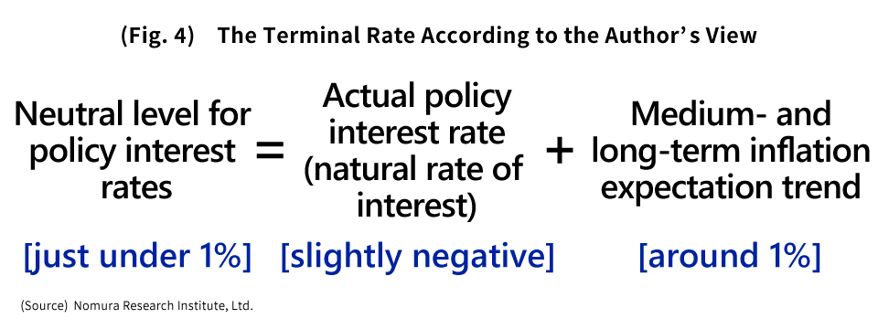 Furthermore, if we assume hypothetically that this is where medium- and long-term inflation expectations will end up landing, then the neutral level for policy interest rates, i.e., the terminal rate, will come out not to around 1.5%, but rather just slightly under 1% (Fig. 4). The Bank of Japan, accounting for the possibility that medium- and long-term inflation expectations could tick down even further going forward, will likely be cautious about raising policy interest rates as it tries to work out where this final landing spot will be.
