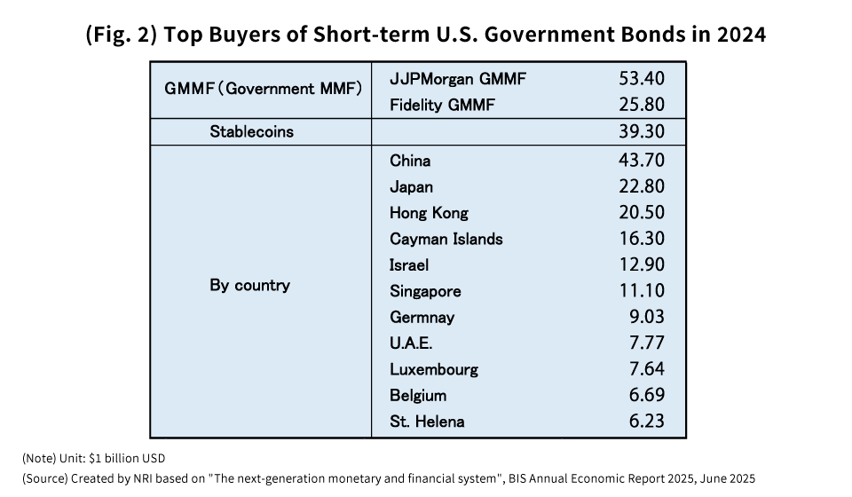 According to the Bank for International Settlements (BIS), stablecoins accounted for $39.3 billion worth of short-term U.S. government securities purchased in 2024, making them the third-largest buyer in U.S. Treasury markets last year, right behind the JPMorgan government money market fund (GMMF) at $53.4 billion and China at $43.7 billion (Fig. 2). Thus, the concern is that if stablecoins force the sale of short-term U.S. government securities, the U.S. economy and the banking system could be dealt a huge blow.